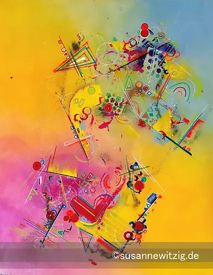 …ein Bild, welches völlig unbewusst die geometrische Serie eingeleitet hat…sonnengelb, kräftiges Pink und zartes Himmelblau bilden die Bühne für ein komplexes Zusammenspiel von Formen und Farben.